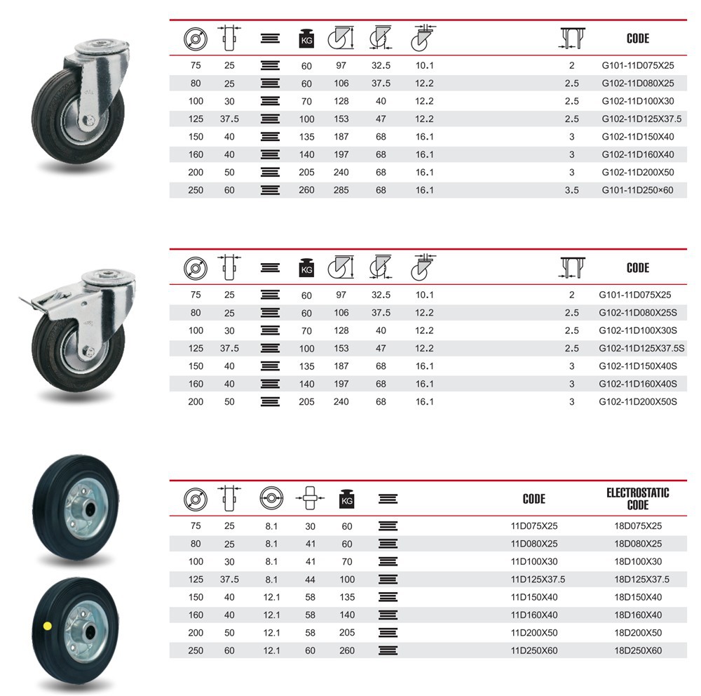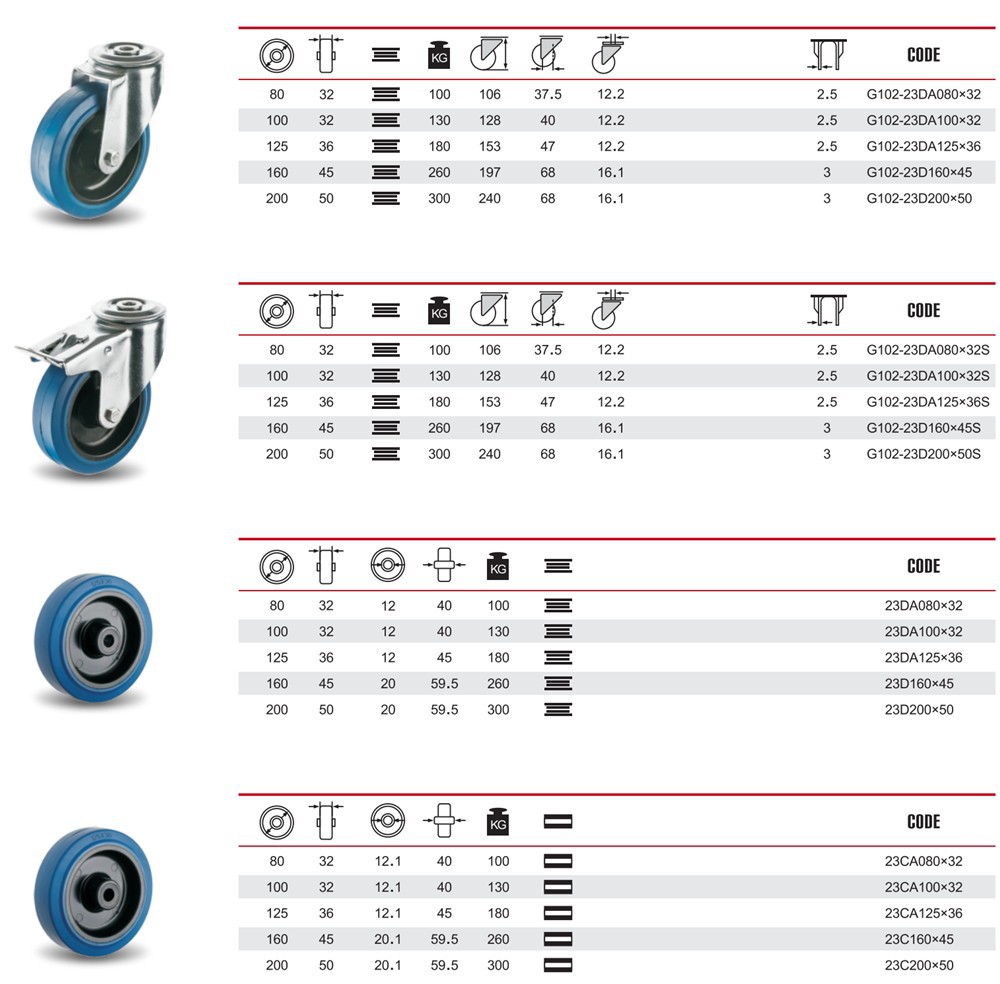 80-200мм меко плави еластични гумени точак, издржљив и стабилан, бешумно се креће, флексибилно ротира, може спречити под и тепих, имамо и клизни лежај и куглични лежај.